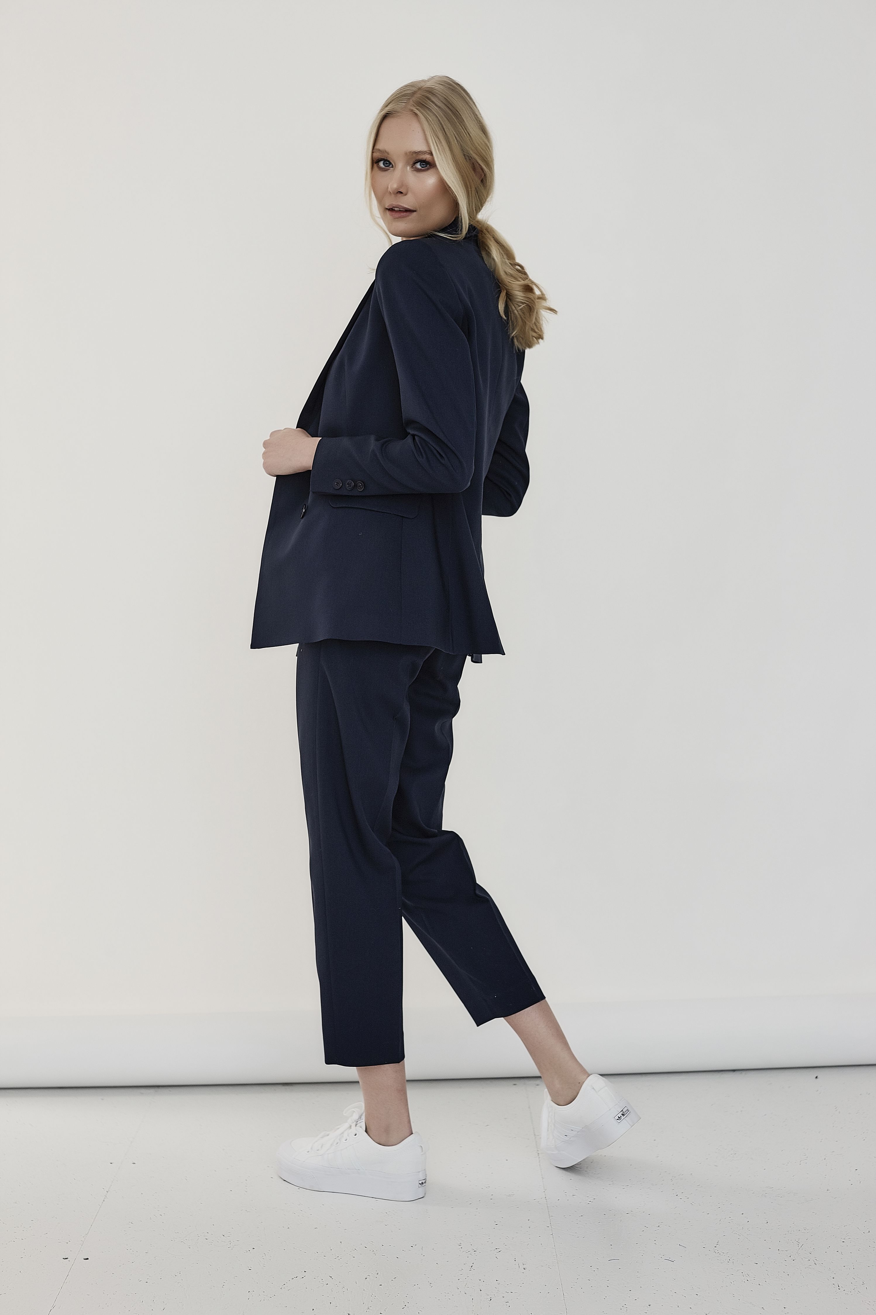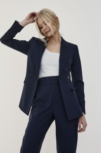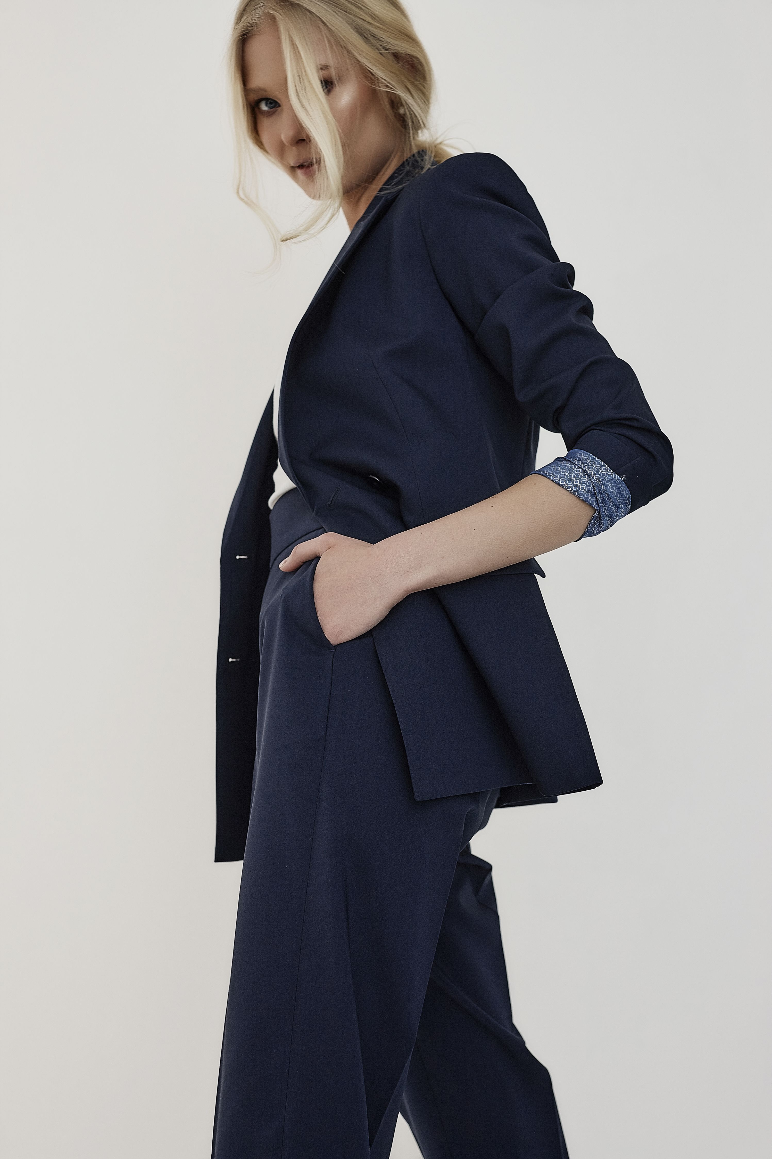Marynarka uszyta z lekkiej, wiskozowej tkaniny w granatowym kolorze. Jest bardzo stylowa i multizadaniowa, pasuje zarówno do jeansów, jak i eleganckich spodni i spódnic. Polecamy ją jako marynarkę do pracy oraz na spotkania biznesowe.