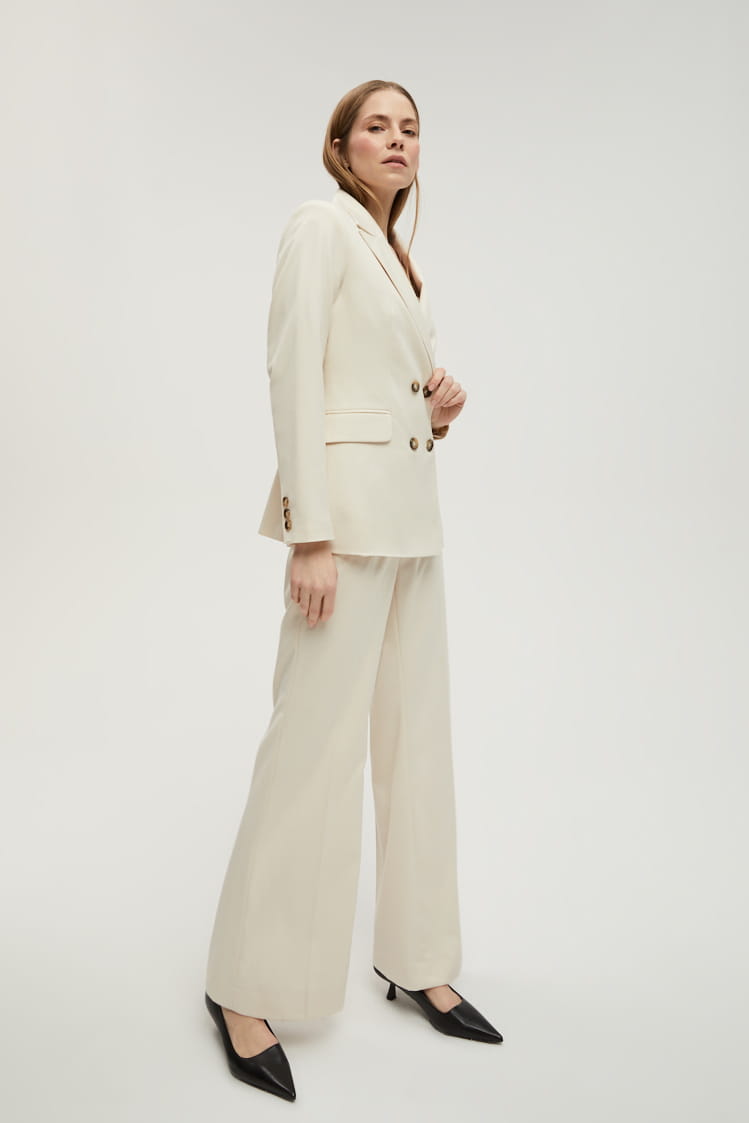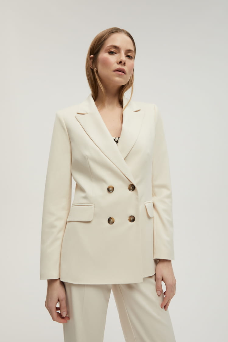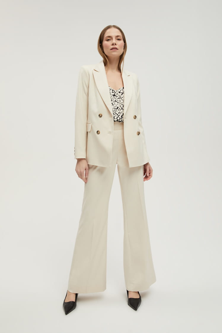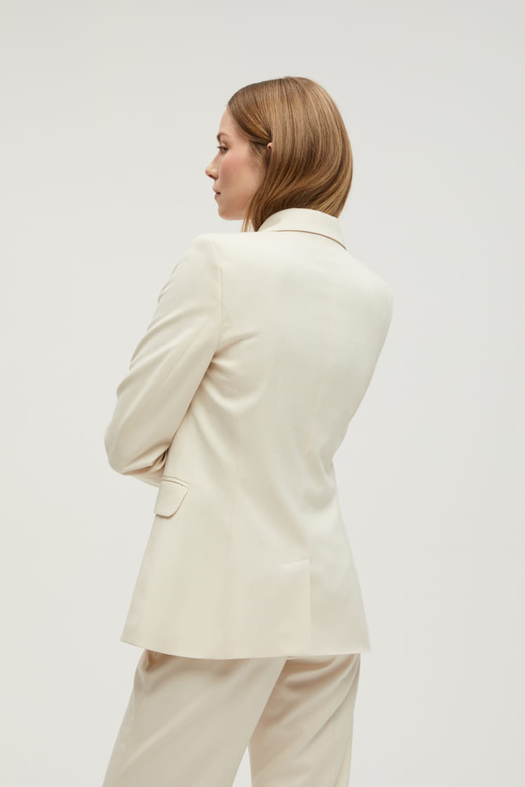 Piękna marynarka uszyta z lekkiej, wiskozowej tkaniny w jasnym waniliowo-beżowym kolorze. Jest bardzo stylowa i multizadaniowa, pasuje zarówno do jeansów, jak i eleganckich spodni i spódnic. Polecamy ją jako marynarkę do pracy oraz na spotkania biznesowe.