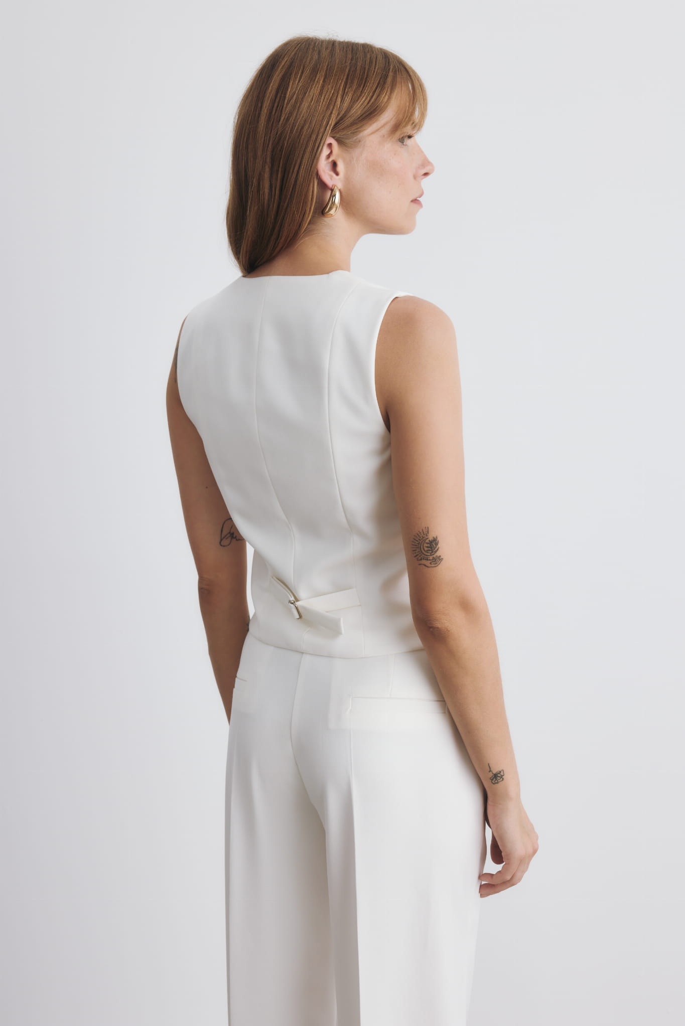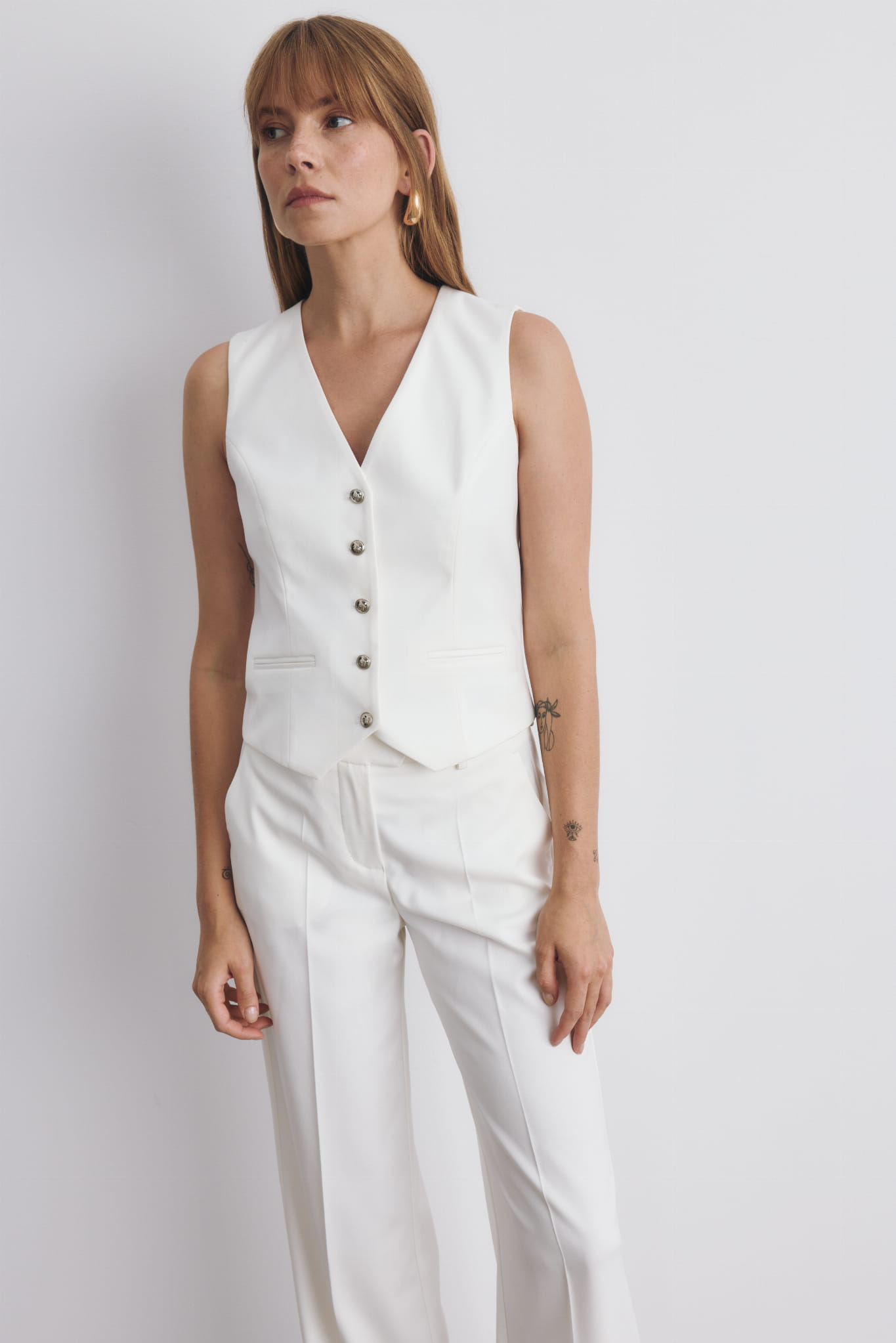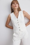 Biała, dopasowana kamizelka, zapinana na pięć małych guzików. Zapięta na ostatni guzik lub rozchodząca się w okolicy ramion pięknie podkreśla kobiecą sylwetkę. Kamizelka z naszymi szerokimi spodniami Olivia tworzą piękny, modowy komplet.