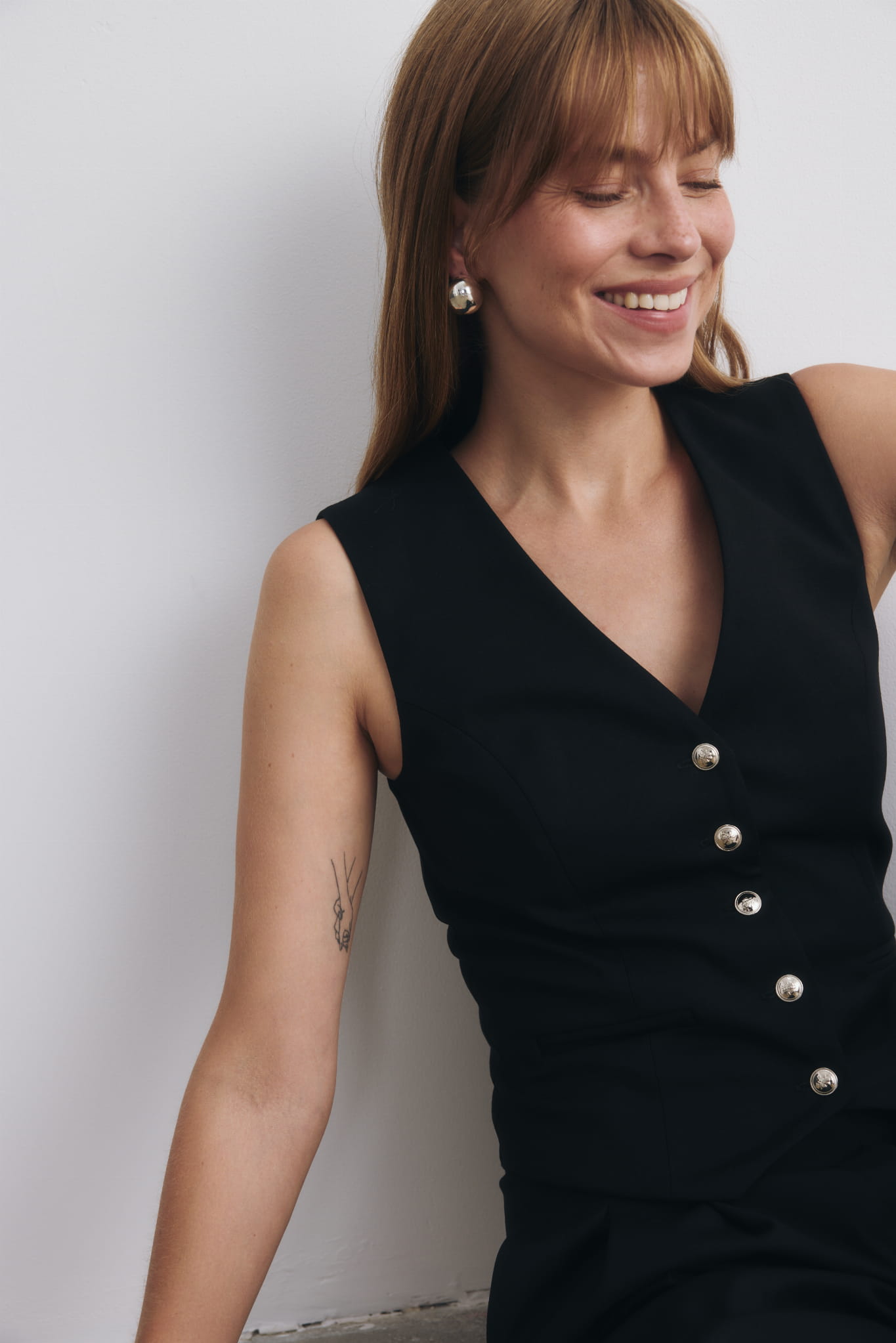 Tej zimy zaglądamy do szaf dziadków, ojców i ukochanych. W różnych wariacjach stylistycznych nasza czarna, klasyczna kamizelka w męskim stylu podbije serce każdej miłośniczki stylu hippie, vintage, boho, jak i tej kochającej nowoczesną klasykę. Zjawiskowo wygląda połączona z białą koszulą, t-shirtem, golfem i apaszką związaną w fular. Zapięta na ostatni guzik lub rozchodząca się w okolicy ramion pięknie podkreśla kobiecą sylwetkę. Kamizelka z naszymi szerokimi spodniami Helen tworzą piękny, modowy komplet.