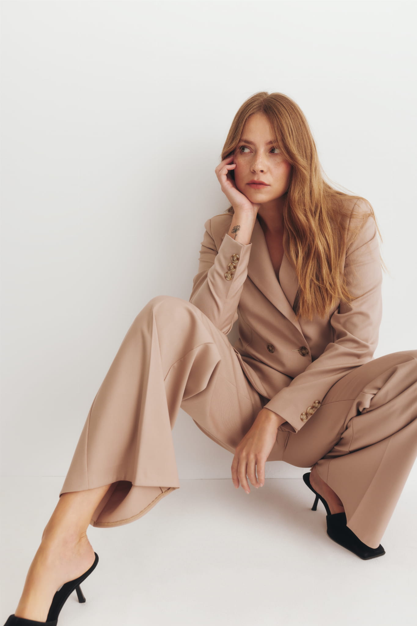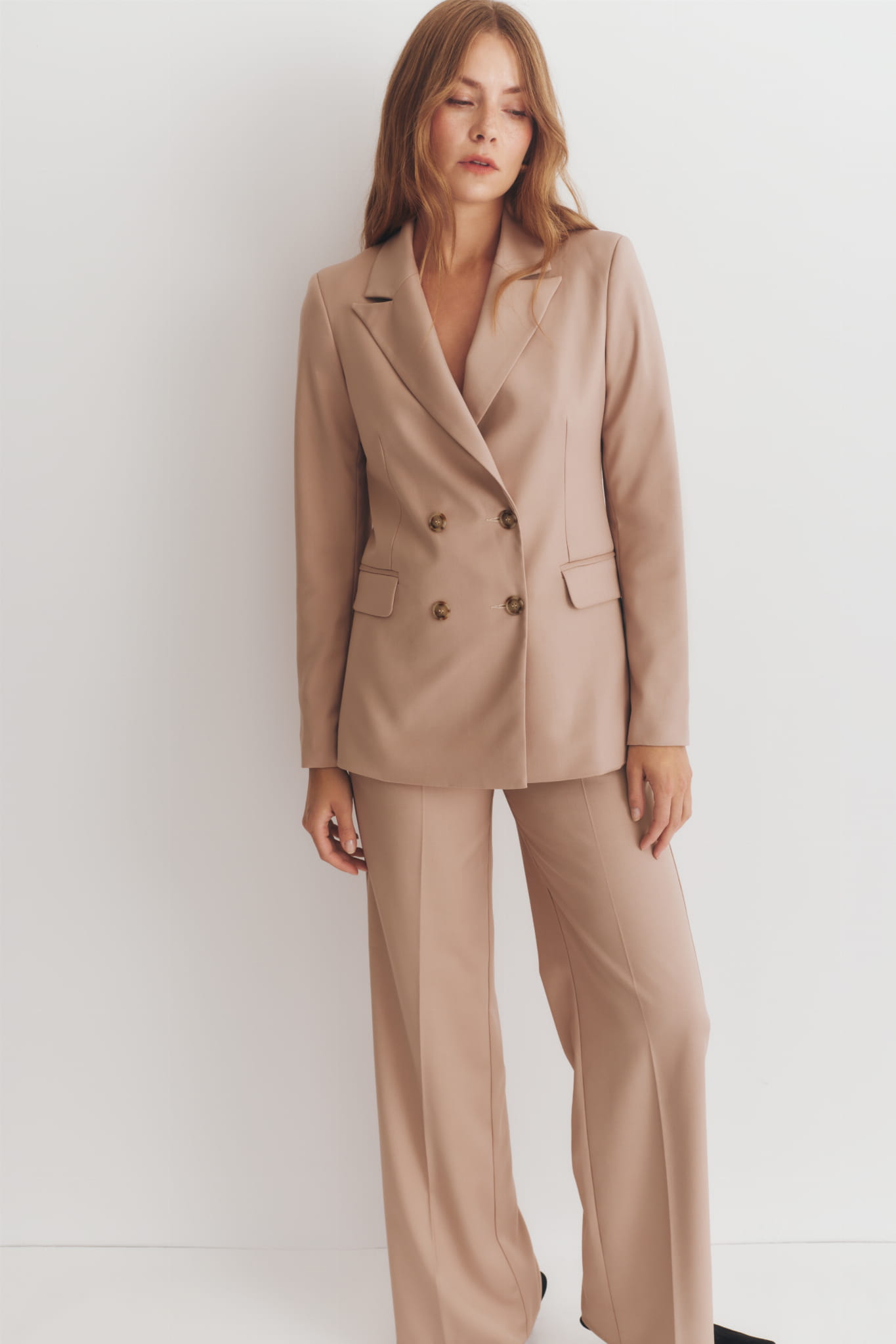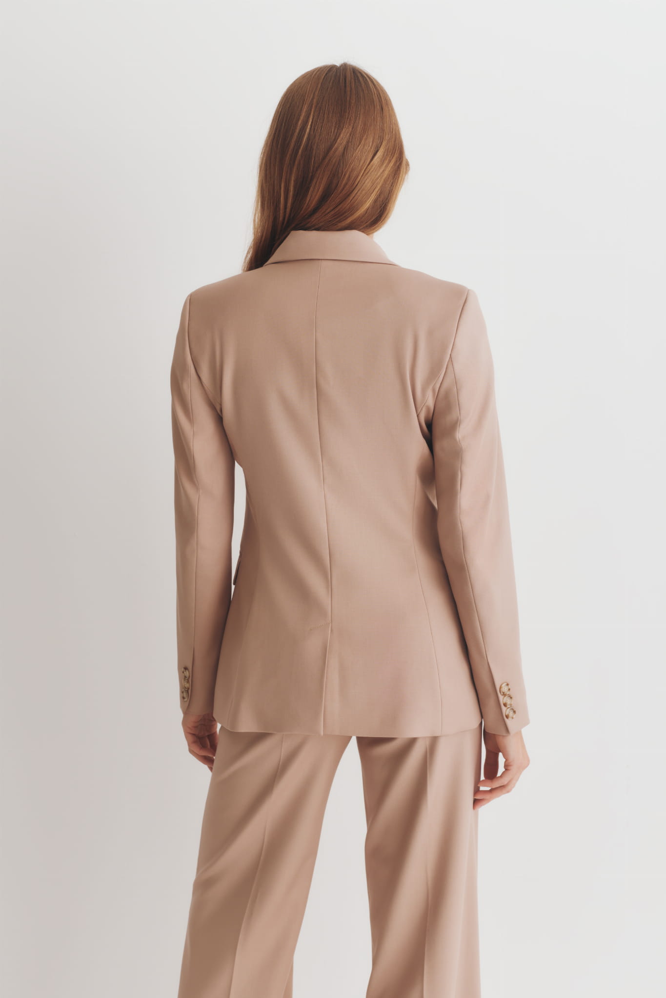 Marynarka uszyta z lekkiej, wiskozowej tkaniny w jasnobeżowym kolorze. Jest bardzo stylowa i multizadaniowa, pasuje zarówno do jeansów, jak i eleganckich spodni i spódnic. Polecamy ją jako marynarkę do pracy oraz na spotkania biznesowe.