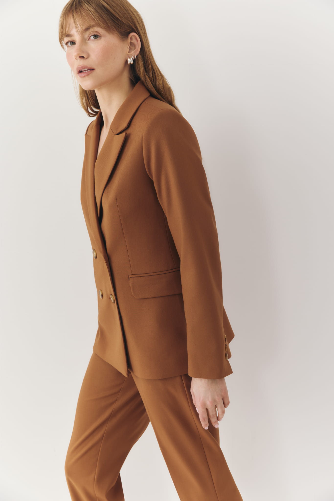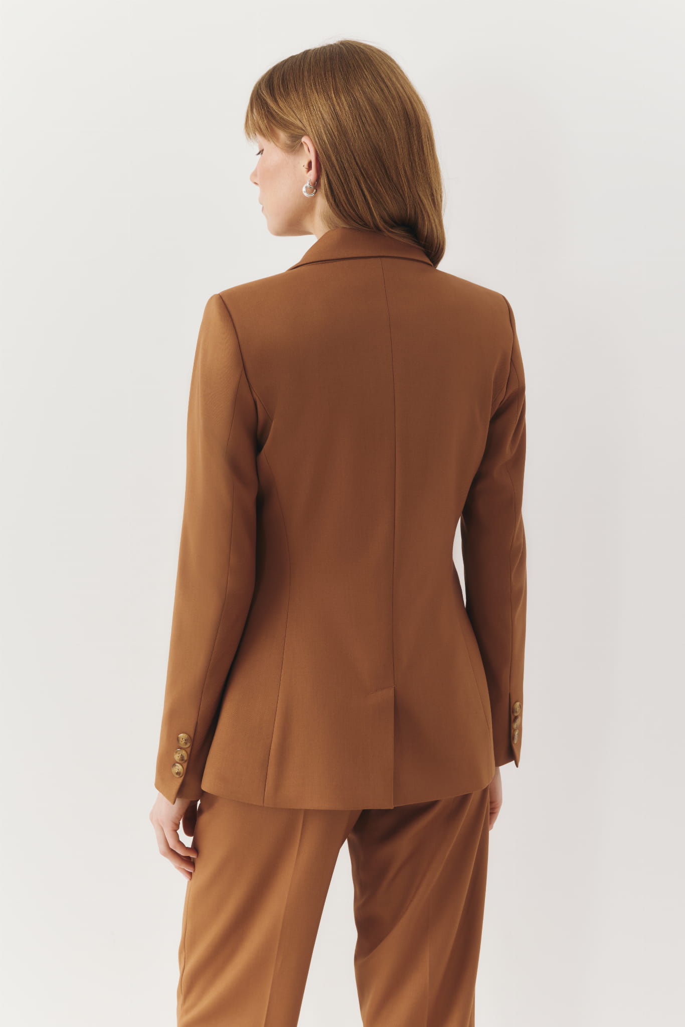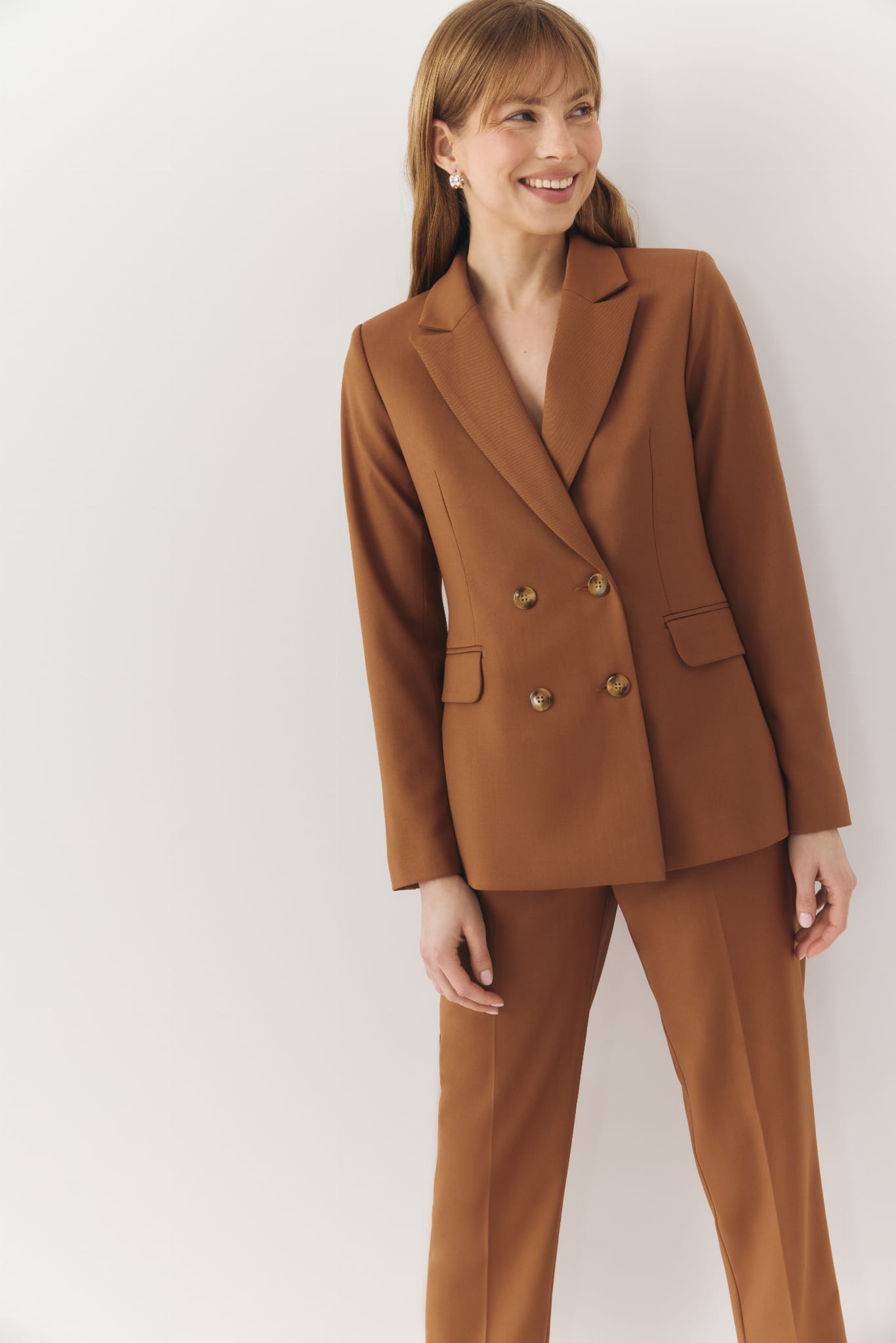Marynarka uszyta z lekkiej, wiskozowej tkaniny w camelowym kolorze. Jest bardzo stylowa i multizadaniowa, pasuje zarówno do jeansów, jak i eleganckich spodni i spódnic. Polecamy ją jako marynarkę do pracy oraz na spotkania biznesowe.