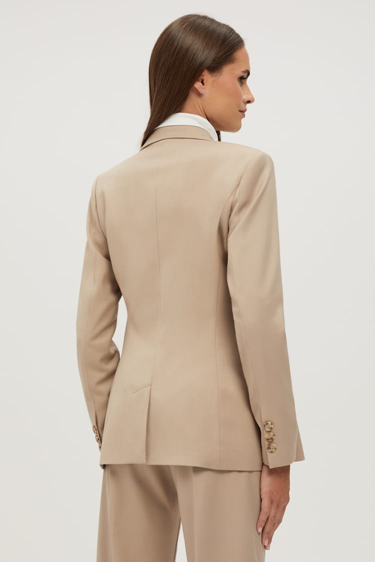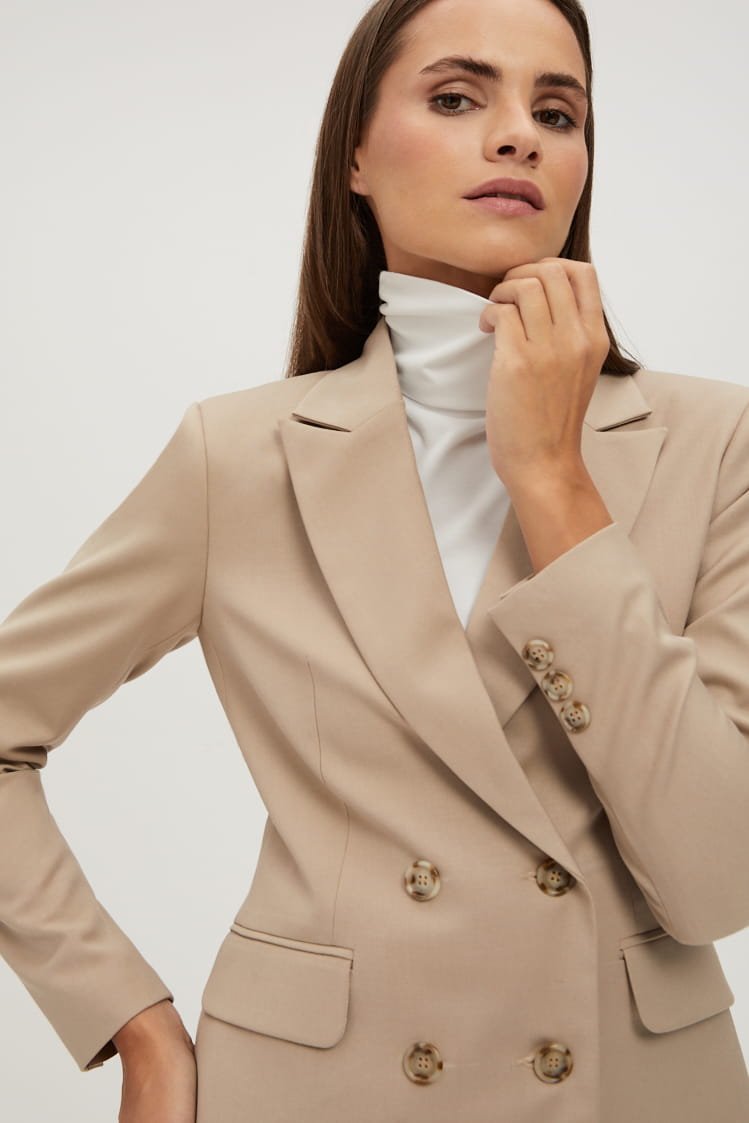 Marynarka uszyta z lekkiej, wiskozowej tkaniny w jasnobeżowym kolorze. Jest bardzo stylowa i multizadaniowa, pasuje zarówno do jeansów, jak i eleganckich spodni i spódnic. Polecamy ją jako marynarkę do pracy oraz na spotkania biznesowe.