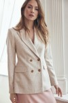 Piękna marynarka uszyta z wyjątkowej jakości i urody tkaniny w jasnym kolorze. Jest bardzo stylowa i multizadaniowa, pasuje zarówno do jeansów, jak i eleganckich spodni i spódnic. Polecamy ją jako marynarkę do pracy oraz na spotkania biznesowe.