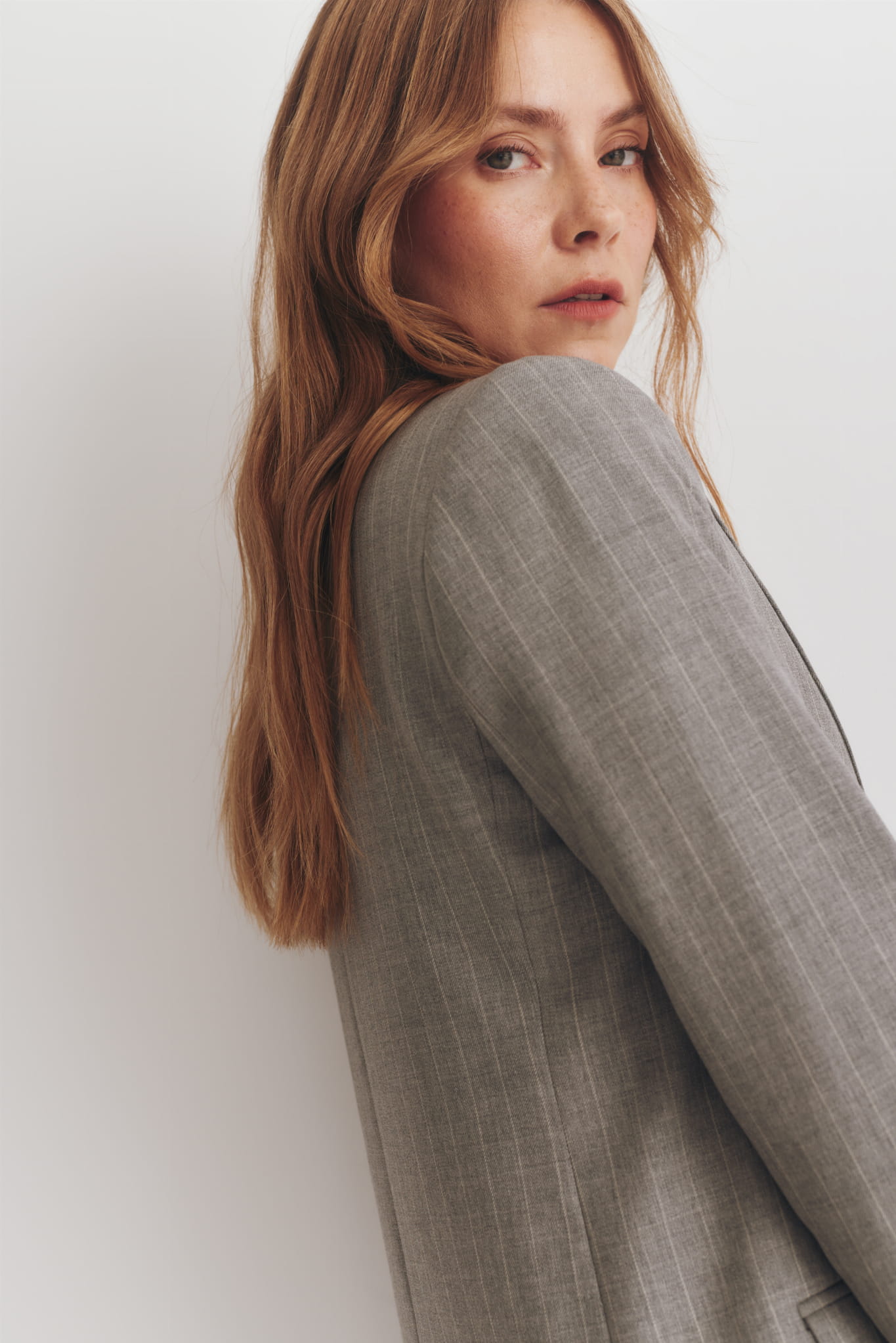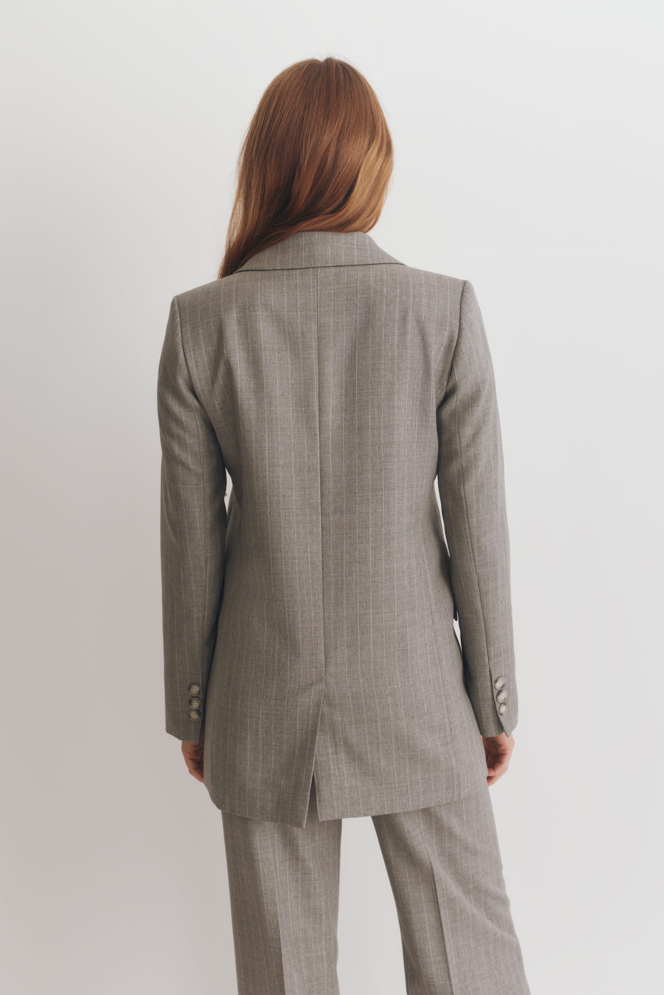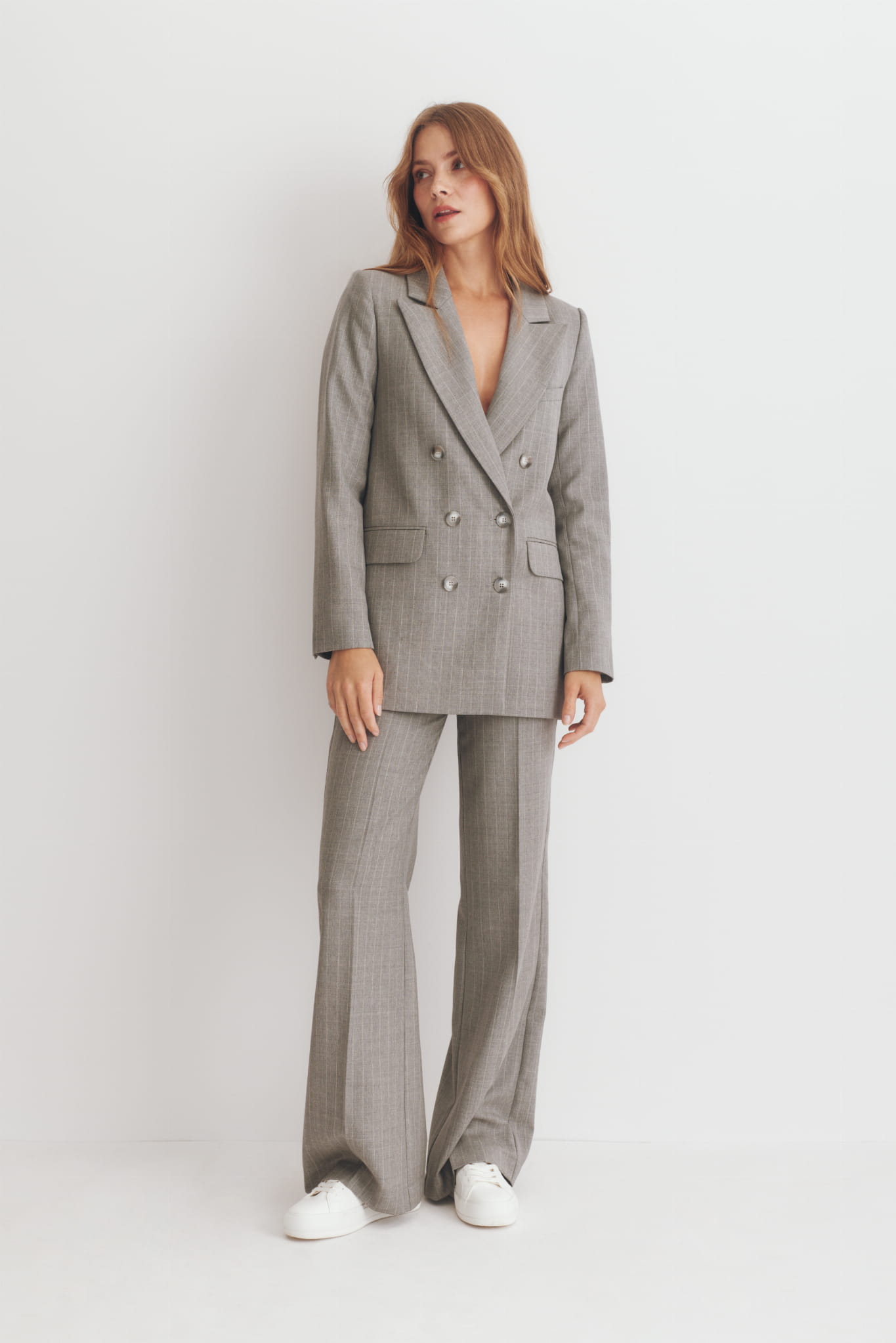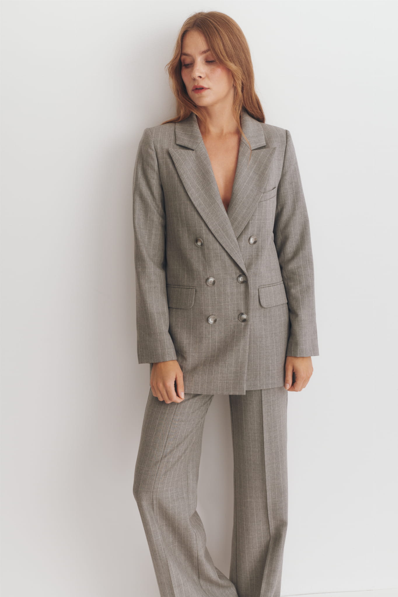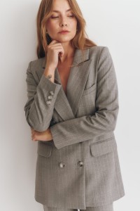 Shirley to propozycja dla wszystkich kobiet, które kochają styl vintage. Dwurzędowa marynarka, o luźnym, pudełkowym kroju uszyta została z wysokogatunkowej tkaniny w kolorze jasnoszarym - wełna merino.