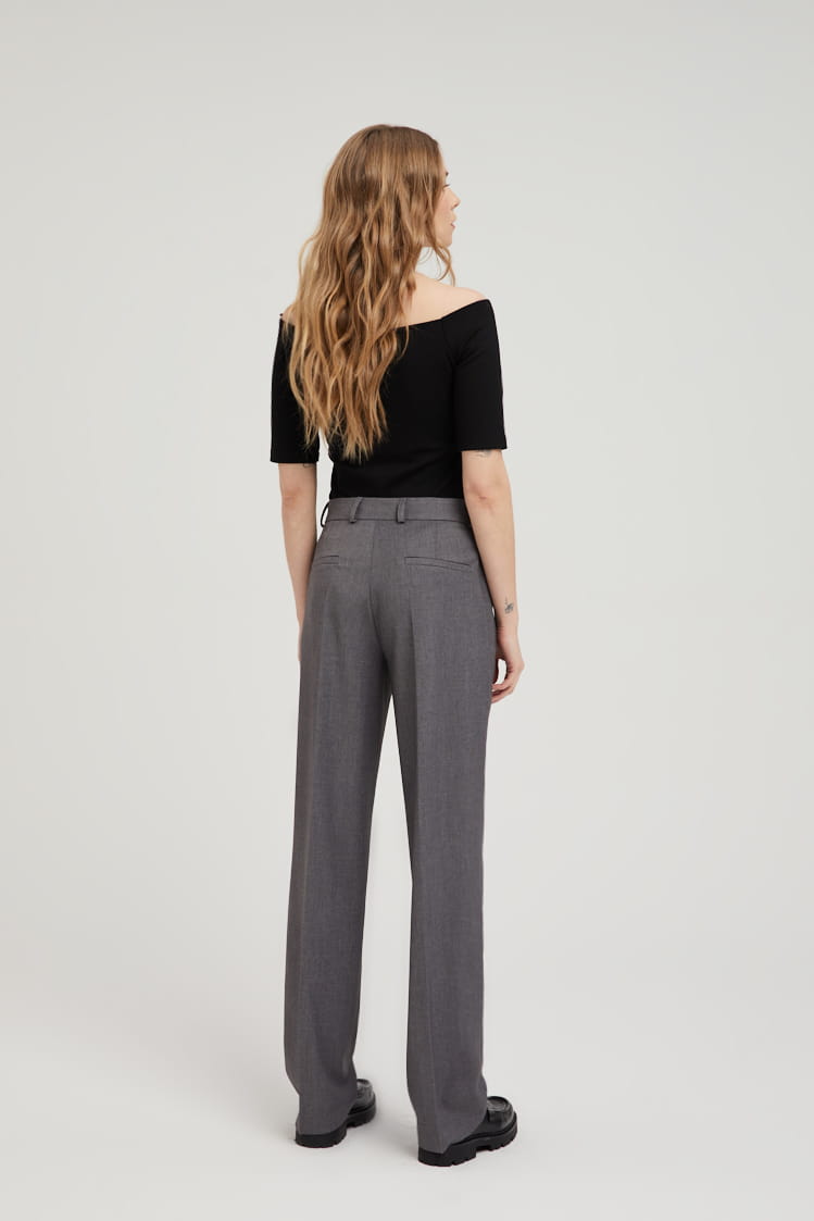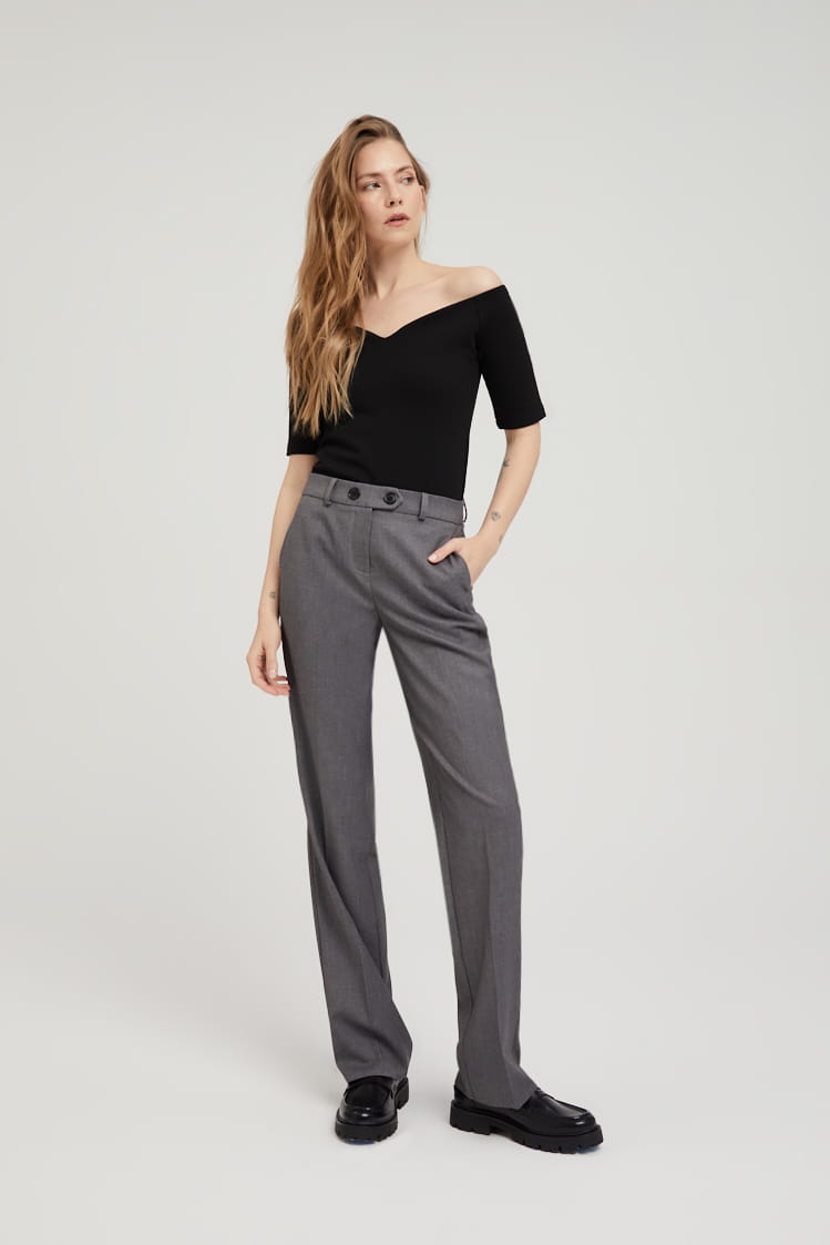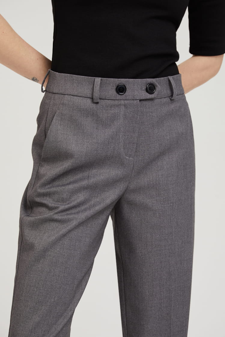 Catherine to bardzo klasyczne, proste spodnie w kant. Zapinane są na zakładkę z pojedynczym guzikiem, który dodaje im uroku. W tym modelu zastosowałyśmy klasyczny pas ze szlufkami, dzięki czemu możesz je nosić z ulubionym paskiem. Uszyte zostały z wysokogatunkowej tkaniny, w której składzie znajduje się wiskoza. Ich krój jest bardzo uniwersalny, spodnie będą pasować zarówno do marynarek i koszul, czy eleganckich bluzek, jak również jesiennych i zimowych swetrów, mięsistych bluz w wersji sportowej.