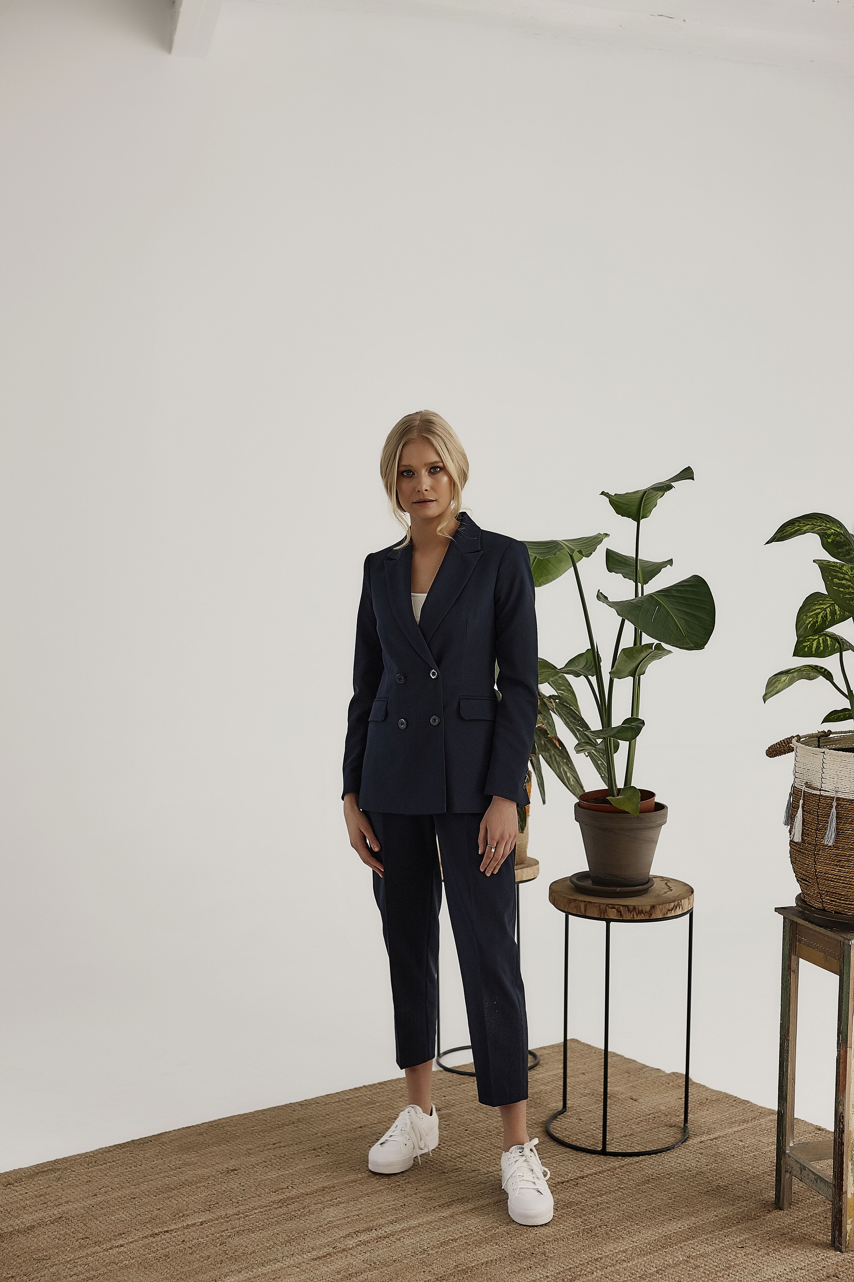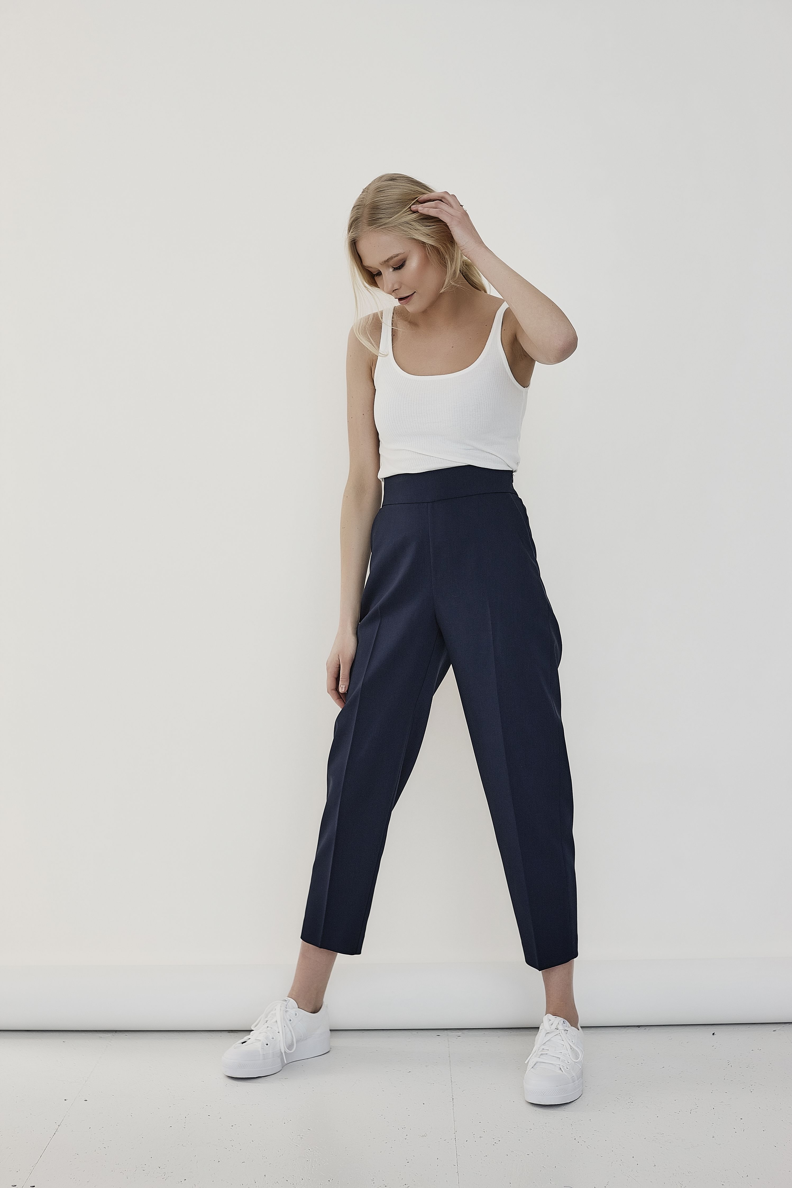 Klasyczne, proste spodnie w kant. Ich fason to dopasowane do sylwetki, lecz nie obcisłe cygaretki o długości 7/8, o podwyższonym stanie. Z tyłu wygodna guma, która zwiększa komfort noszenia. Z boku zgrabnie ukryty zamek, dzięki któremu spodnie łatwo się zakłada i zdejmuje. Z marynarką tworzą modowy garnitur, doskonałe są również do koszul, eleganckich bluzek, a także jesiennych swetrów.